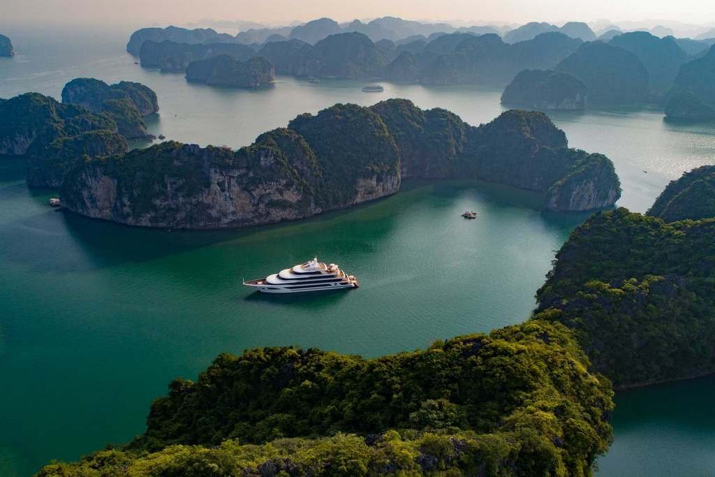 Known as the largest overnight cruise ship in Halong Bay, it offers spacious cabins, luxurious amenities, and activities like fine dining and panoramic sightseeing. This ship accommodates a high number of guests while maintaining a high-end experience.